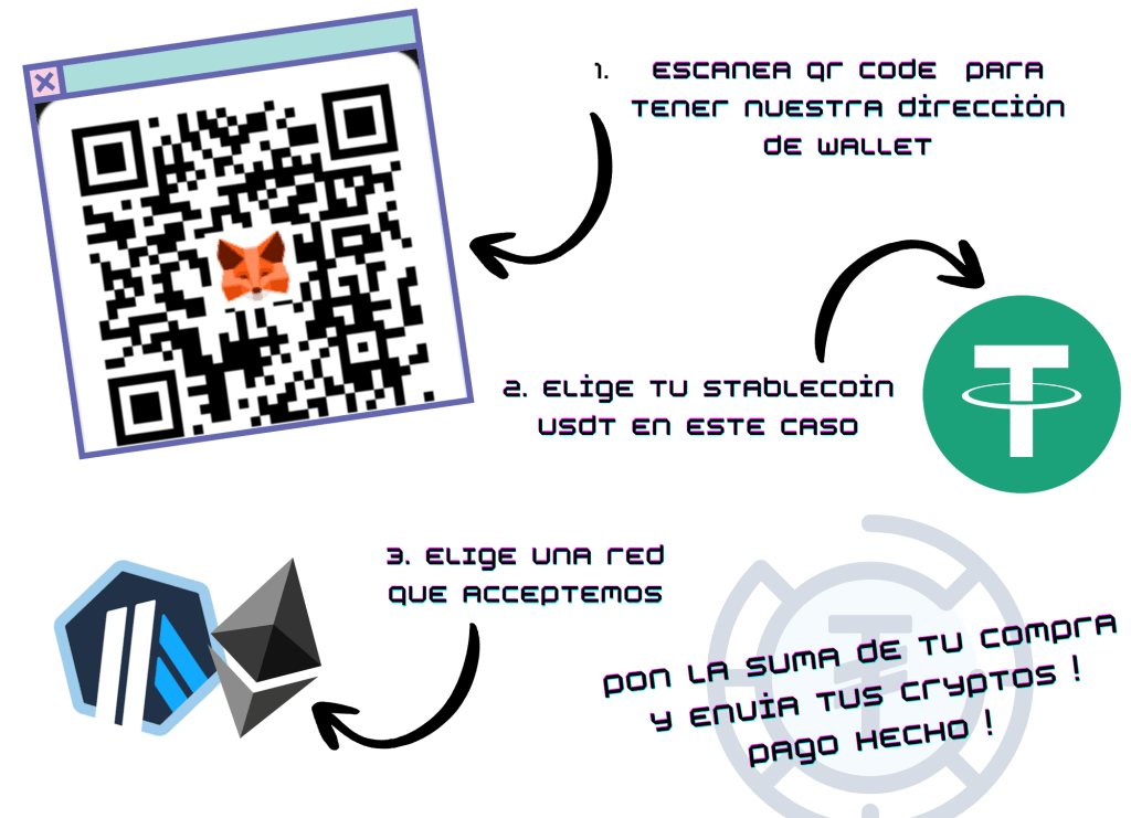 Somos conscientes del creciente uso de las stablecoins como un puente eficaz entre las criptomonedas volátiles y las monedas fiduciarias, y queremos que las utilices para disfrutar de lo que te gusta. Este es un modelo de comercio electrónico con criptomonedas que elimina las barreras y simplifica el proceso de compra.
